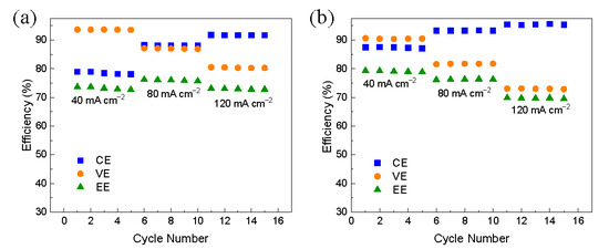 Further, the performance of VFBs with M3-300 and M2-300 membranes at the different current densities was explored and shown in Figure 5. At every setting current density, even as high as 120 mA cm−2, the efficiency of VFBs was kept stable. As the current density rose, the CEs of VFBs increased owing to the reduced crossover of the vanadium ions, and a VFB assembled with the M3-300 membrane exhibited a CE of 94% at the current density of 120 mA cm−2. In addition, with the increase of the current density, the VEs of VFBs decreased due to the rising ohmic resistance. Thus, a VFB with M2-300 membrane showed the highest EE of 76% at the current density of 80 mA cm−2 and an EE of over 70% at a high current density of 120 mA cm−2, demonstrating a very good rate capability.
