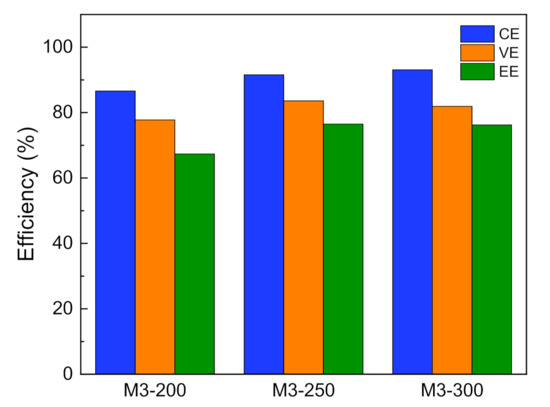 For the solvent post-processing method, the treatment time has a major impact on the pore structure and the performance of the PAN porous membranes. Thus, we prepared the modified membranes treated for different drying times, named MX-300, where x (0, 1, 2, 3) represented the drying time (h). In addition, the performance of the VFBs assembled with MX-300 membrane at the current density of 80 mA cm−2 was tested and shown in Figure 3. As the drying time increases, CE of VFBs with MX-300 membrane gradually increased in accordance with the ion selectivity, which benefitted from the decreased pore size after the solvent post-processing. The CE of M3-300 membrane reached 93% at the current density of 80 mA cm−2, which was 25 percent higher than M0-300 membrane (CE = 68%). However, VE of the VFBs with MX-300 membrane was reduced owing to the reduced pore size. Yet benefiting from the good pore interconnectivity, VE dropped slightly. As a result, after the solvent post-processing, M2-300 and M3-300 membranes showed the EE of ~76%, much higher than that of M0-300 membrane. The energy efficiency of VFB is slightly lower than that of Nafion 212 membrane, but PAN porous membrane is cost-effective, and the performance of a VFB with the porous membrane is acceptable.