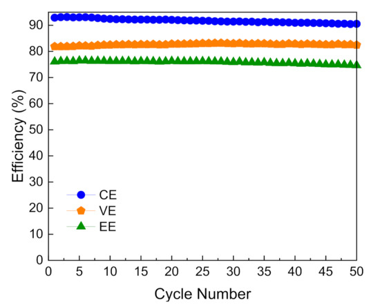The long-term stability of M3-300 membrane was evaluated on-site by the charge-discharge cycling test of VFBs with M3-300 membrane. As shown in Figure 7, the battery using M3-300 membrane could run stably for over 50 cycles and the CE, VE, and EE of VFBs had little decay with the cycle numbers at a current density of 80 mA cm−2, exhibiting good stability. These results indicate that the pore structure of the PAN porous membrane after the solvent post-processing is stable during the running process in VFB.