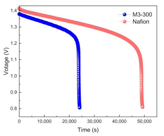 The self-discharge performance is an important parameter to judge the ion selectivity of porous membranes. A VFB with M3-300 membrane was charged to 100% SOC at the current density of 80 mA cm−2, and then stand until the OCV is lower than 0.8 V. The open-circuit voltage of a VFB with M3-300 membrane over time was recorded and shown in Figure 9. The open-circuit voltage of the VFB gradually decreased with the standing time, which meant there was a certain vanadium ion penetration and the side reactions in the static state. But the voltage decreased lowly from the initial 1.38 V to 1.2 V after 23,000 s. The results indicate that M3-300 membrane has high ion selectivity and greatly hinders vanadium ions from the catholyte and anolyte to ensure stable performance of VFBs.