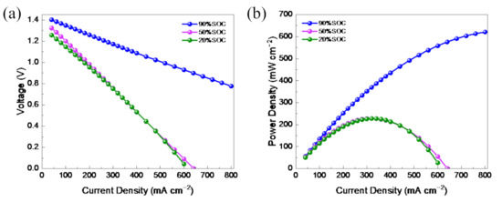 The polarization curve and power density of the VFB assembled by M3-300 membrane were measured at room temperature and are shown in Figure 6. At the galvanostatic charging mode, the VFB was charged to 20%, 50%, and 90% SOC. Next, the VFB was discharged at the different current densities, and the voltage was recorded, then the power density was calculated. As shown in Figure 10a, the voltage showed a linear decline with the increase in the discharge current density. At 20% or 50% SOC, a VFB with the M3-300 membrane reached the peak power density of 235 mW cm−2 at the current density of 350 mA cm−2. While a VFB with the M3-300 membrane at 90% SOC was capable of delivering a limiting current density of 900 mA cm−2, and a high peak power density of 650 mW cm−2, which was very competitive among the various flow batteries.