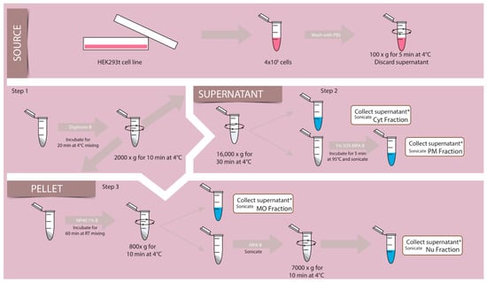 We previously described the steps we performed to obtain proteins from four different compartments (Cyt, PM, MO, and Nu) using HEK cells, as schematized in Figure 1.