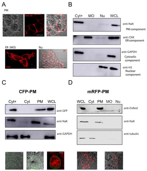 Extraction of proteins from different cell compartments. (A) Fluorescent microscopy images of the HEK293 cells used showing the labeling of the plasma membrane (top panel) with DiIC18 dye (red, middle panel), a light microscopy image (left panel), and the merge (right panel). The CNX (calnexin, red) stain (bottom left panel) used as a marker for MO or the PI (Propidium iodide, red) stain (bottom right panel) used as a marker for the nucleus. (B) Representative WB membrane showing lysates generated from HEK cells fractionated into a Cyt+ (cytosolic plus fraction), MO (membranous organelle), and nucleus comparing proteins enriched in the fractions to those present in a WCL (whole-cell lysate). (C) Membrane showing the extraction of the Cyt and PM fractions from the initial Cyt+ fraction illustrated by the enrichment of the CFP-PM-expressed protein detected by a GFP antibody concomitant with the enrichment of a NaK (sodium–potassium ATPase) antibody, separated from the Cyt (enriched in GAPDH protein with the absence of GFP band); lower panels show CFP-PM- expressing HEK cells images (with transmitted light and PI staining). (D) Cells expressing the mRFP-PM protein were extracted to show the protein enrichment in the PM fraction (using an anti-DsRed antibody) separate from all other fractions, with confirmation of the enrichment of NaK in the same fraction; lower panels show images of the cells used detected with filters for mRFP excitation and a light microscopy merged image. Scale bar, 10 µm.