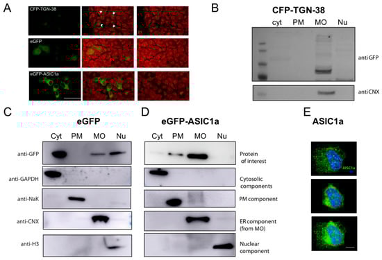 Validation of fractionation method with exogenously expressed proteins. (A). Representative immunofluorescence images of HEK cells expressing CFP-TGN-38 (top panels; arrows pointing at areas of cells with eGFP signal), eGFP (middle panels), and eGFP-ASIC1a (lower panels). Signal in green accounted for the fusion protein detected (left panels); PI (Propidium iodide) in red for nuclei (right panels); merge images (middle panel). Scale bar 10 um. (B) CFP-TGN-38-expressing cells were subjected to the fractionation protocol, and the lysates for each fraction were analyzed by Western blot experiments. As visualized in a representative membrane, the protein was enriched in the MO fraction (detected with an anti-GFP antibody), as expected, together with a marker for ER (using the anti-calnexin antibody). (C) eGFP-expressing cells were subjected to the fractionation protocol, and the lysates for each fraction were analyzed by Western blot experiments. As visualized in a representative membrane, the protein was enriched in the cytosolic, MO, and nuclear fractions, as expected. Each one of the fractions was confirmed to be enriched in proteins known to be abundant (GAPDH for Cyt; NaK for PM; CNX for MO (from the ER); and H3 for Nu). (D) eGFP-ASIC1a-expressing cells were subjected to the fractionation protocol, and the lysates for each fraction were analyzed by Western blot experiments. As visualized in a representative membrane, the protein was enriched in the PM and MO fractions. (E) Representative confocal microscopy images of HEK293 cells stained with an anti-ASIC1 antibody (and secondary Alexa-488, green), and with PI to visualize nuclei, showing a superficial section (top), a middle section (middle), and a merge of layers (bottom). Notice a predominant perinuclear staining. Scale bar 5 µm.