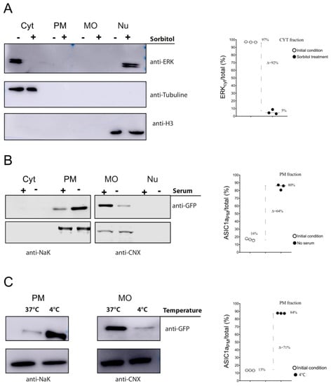 Fractionation to detect changes in protein distribution. (A) Representative WB membranes of HEK293 cell lysates obtained by the fractionation method to detect total ERK protein in the different fractions (Cyt, PM, MO, Nu) in control (−) or sorbitol-treated (+) cells using an anti-total ERK antibody with tubulin as a cytosolic marker or histone as a nuclear marker. Plot showing the percent changes of fractions for both conditions. (B,C) Representative Western blots of eGFP-ASIC1a-HEK293-expressing cell lysates obtained by our fractionation method to detect eGFP-ASIC1a protein in MO and Nu fractions exposed to either a 120 min medium without serum incubation, as opposed to the normal (+ serum) incubation, (B) or a 20 min 4 °C incubation, as opposed to the normal 37 °C incubation (C); to the right, plots showing changes in the percent fractions for either condition.