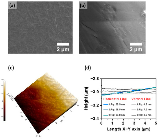 Membrane morphology mainly depends on the phase separation process, which determines the uniform distribution of crystalline and amorphous regions. FE-SEM is used to analyze the surface morphology of the membrane at a 2-micrometer scale, as presented in Figure 5a,b. It displays that the pure PVDF-HFP membrane shows a dense morphology where no porous morphology is observed on the surface of the pure PVDF-HFP membrane, and this is due to the formation of a dense polymer network. However, sulfonated-PVDF-HFP with exfoliated nanosheet-based membrane shows a wrinkled morphology without obvious agglomeration, signifying a well-distributed nature of nanosheets throughout the membrane. The membrane surface roughness was further confirmed from the atomic force microscopy, as illustrated in Figure 5c. The surface topography demonstrates a defect-free uniform dense membrane. It implies that the prepared altered sulfonated-PVDF-HFP membrane shows a nanometer size phase-separated region, which could not be visible through this technique. Thus, the calculated value ~1.6 nm wide ionic phase in the dry state of the membrane evaluated from Bragg’s equation using small-angle X-ray scattering is relevant. The top surface of the modified sulfonated-PVDF-HFP membrane shows roughness at the nanometer scale. The estimated average root means square of high deviation Rq value at different regions was recorded, as presented in Figure 5d. Topographic roughness was calculated using horizontal and vertical lines, and the computed Rq value lies between 36 to 40 nm for horizontal lines and 3.5 to 7.5 nm for vertical lines. Both techniques confirm the low roughness of the membrane. The membranes’ smooth surface provides an efficient interaction with saltwater when implemented in the RED device.