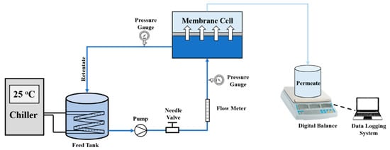 The separation performance of the prepared membranes was also evaluated using a crossflow filtration setup (Figure 1) which consisted of a chiller, a feed tank, a feed pump, a flow meter, a needle valve, a pressure gauge, a permeated collector, and a membrane module with an effective filtration area of about 42 cm2. The filtration tests were conducted at a pressure of 1 bar and the weight of the permeate was measured after 1 h of filtration time.