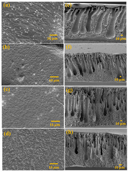 SEM pictures of the prepared membranes: (a) Surface CCAM-0% showing a dense structure; (b) surface CCAM-2%; (c) surface CCAM-8%; (d) surface CCAM-10% presenting a reduction in pore size after introducing MXene into the CA matrix; (e) cross-section of CCAM-0% displaying a dense structure; (f) cross-section of CCAM-2%; (g) cross-section of CCAM-8%; and (h) CCAM-10% cross-section showing a disordered channel arrangement.