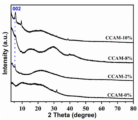 The CCAM-X% membranes were studied using XRD to determine the effect of the distribution of the 2D MXene sheets into the CCAM polymer matrix (Figure 3). CCAM-0% was characterized by (002) diffraction peaks at [18,32]. The (002) diffraction peak spotted at can be attributed to DL-MXene. The MXenes showed good interaction with CA due to the observed shift of the (002) MXene diffraction peak by 2 to a smaller angle after MXene loading [33]. This showed that membrane crystallinity was influenced by the amorphous nature of CA which caused this shift. Similarly, the (002) diffraction peak shift in the direction of smaller angles after introducing MXene content into the CA matrix was due to a greater dispersion of the MXene sheets along with the CA matrices. The formation of a Ti3C2Tx (MXene)/CA hybrid membrane was confirmed by the intercalation of the CA chains with the MXene sheets [23].