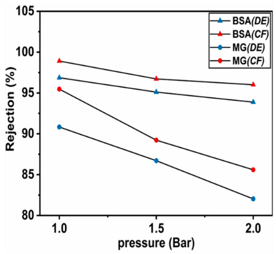 Effect of the operating pressure (1–2 bar) on the rejection of MG (100 ppm) and BSA (150 ppm) using DE (blue symbol) and CF (red symbol) filtration (CCAM-10%) for 1 h.