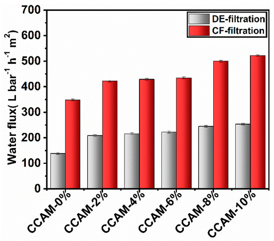 The impact of MXene loading on the permeation flux using membranes in both CF and DE filtration modes were measured and plotted, as shown in Figure 6. Out of all the membranes (CCAM (0–10%)) tested using CF filtration, the highest water flux was observed for CCAM-10% (522.3 LMH). This was attributed to the hydrophilic nature of MXene and its consequential development of extra nanopores in the membrane [18]. Moreover, membranes with higher roughness offer a more open area for membrane transport; thus, the permeation flux was enhanced with the increased surface roughness obtained by the addition of MXene [43]. Higher surface roughness was expected to increase the specific surface area by providing a greater contact area for the foulants and improving the hydrophilicity of the membrane, thus increasing the feed water flux, as demonstrated in previous studies using dead-end filtration [44,45] and crossflow filtration [46].