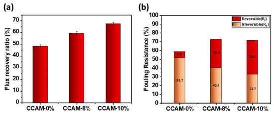 (a) Water recovery ratio of CCAM-0%, CCAM-8%, and CCAM-10% after fouling using 500 ppm BSA protein solution using CF filtration; (b) fouling resistance ratios of CCAM-0%, CCAM-8%, and CCAM-10% using CF filtration.