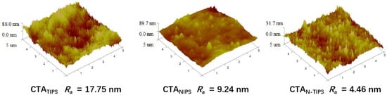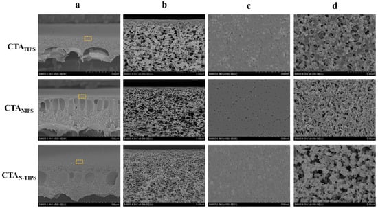 First, 10 wt% CTA was added into DMSO2/PEG400 mixtures (the weight ratio was 70:30) and stirred at 160 °C to obtain a homogeneous solution. After it was degassed, the casting solution was rapidly poured onto a polyester-screen-wrapped mold, which was preheated at 140 °C. Then, a liquid film was cast on the polyester screen using a casting knife with a height of 200 μm. It should be mentioned that the polyester screen was pretreated by infiltration in a 5 wt% PVA solution for 30 min. Then, three kinds of phase-separation methods were introduced to obtain different CTA porous substrates, and the corresponding preparation conditions were listed in Table 1 according to our previous work [,,]. CTATIPS, CTAN-TIPS, and CTAN-TIPS represent the CTA porous substrates prepared via TIPS, NIPS, and N-TIPS methods, respectively.