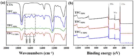 ATR-FTIR was used to characterize the surface chemical composition of TFC-FO membrane and confirm the formation of a polyamide (PA) layer on the CTA substrate. As shown in Figure 4a, three absorption peaks at 1663 cm−1, 1610 cm−1, and 1542 cm−1 were detected, which represent the stretching vibration of -C=O (amide I), the aromatic amide bond, and the stretching band of C-N (amide II), respectively []. Moreover, the XPS spectra also indicated the formation of PA layer based on the signal of nitrogen element (Figure 4b). These results reveal that the IP reaction was conducted and a PA-selective layer was formed on all kinds of CTA porous substrates. Furthermore, the surface element content of TFC-FO membranes was further calculated by the XPS result (Table 2). According to the O/N ratio, the cross-linking degree of PA on TFCNIPS membrane is higher than those of TFCTIPS and TFCN-TIPS membranes.