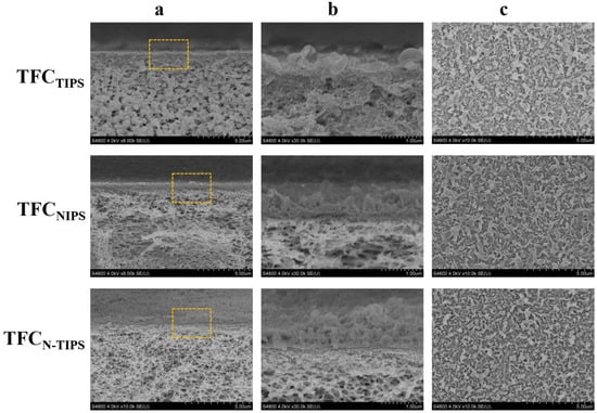 SEM images illustrating the cross-section (a,b) and top surface (c) of TFC-FO membranes. The images of line b show the magnified morphology of the regions indicated by the rectangles in the images of line a.