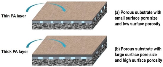 Schematic of PA layer formed on different porous substrates. (a) A substrate with small surface pore size and low surface porosity prefers to form a thin PA layer; (b) a substrate with large surface pore size and high porosity prefers to form a thick PA layer.
