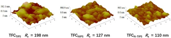 Moreover, AFM was also conducted to detect the surface morphology and the mean roughness (Ra) of the TFC-FO membranes. As can be seen in Figure 7, the rutted and uneven surface is obvious on TFCTIPS membrane, whereas the small bulges homogenously lay on TFCNIPS membrane. This result is similar to that observed under SEM, as mentioned above. Correspondingly, the Ra values for TFCTIPS (198 nm) are much larger than those for TFCNIPS (127 nm), and TFCN-TIPS (110 nm). This result suggests that CTA porous substrates with a smooth surface and high surface porosity may lead to relatively smooth PA films.