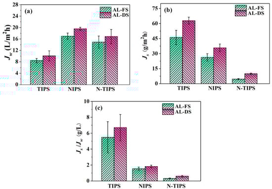 The FO performance of the fabricated TFC-FO membranes was evaluated in both AL-FS and AL-DS by using DI water as a feed solution and 1 M NaCl as a draw solution. As shown in Figure 8a, all the TFC-FO membranes displayed higher water fluxes in AL-DS than those in AL-FS due to the severe ICP effect in the AL-FS. Among others, TFCN-TIPS (16.84 LMH in AL-DS and 14.89 LMH in AL-FS) and TFCNIPS membranes (19.54 LMH in AL-DS and 16.94 LMH in AL-FS) presented relatively higher water fluxes than TFCTIPS membrane (10.08 LMH in AL-DS and 8.41 LMH in AL-FS). Moreover, the reverse salt flux of TFCN-TIPS membrane was much lower (4.67 gMH in AL-FS, and 10.03 gMH in AL-DS) than in TFCN-TIPS and TFCTIPS membranes (Figure 8b). Therefore, TFCN-TIPS membrane demonstrates the smallest specific salt flux (JS/JW ratio), indicating the best selectivity for water molecules (Figure 8c).