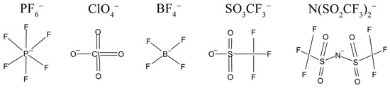 The structural formulas of anions of lithium salts used in electrolytes for LIB are shown in Figure 1.