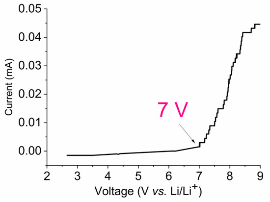 Figure 3 shows the voltammogram of the Li/PE/NS cell for the electrolyte composition PEDA–LiClO4–EC. The upper window of electrochemical stability is almost 7 V vs. Li+/Li [62].