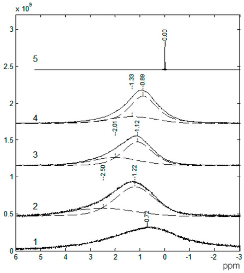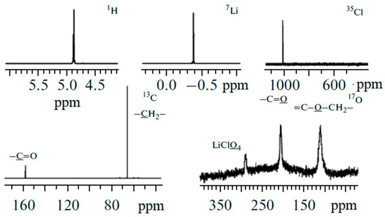 - Lysak, D.A.; Marinin, A.A.; Dzhimak, S.S. Investigating the Nuclear Magnetic Resonance of the Structure of Electrolyte Based on a LiClO4-Ethylene Carbonate Solution. Bull. Russ. Acad. Sci. Phys. 2011, 75, 1668–1670. [Google Scholar] [CrossRef]