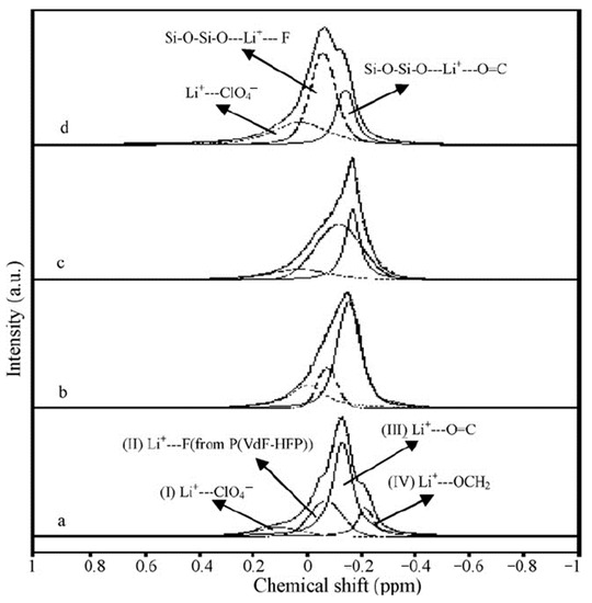 - Saikia, D.; Chen-Yang, Y.W.; Chen, Y.T.; Li, Y.K.; Lin, S.I. 7Li NMR Spectroscopy and Ion Conduction Mechanism of Composite Gel Polymer Electrolyte: A Comparative Study with Variation of Salt and Plasticizer with Filler. Electrochim. Acta 2009, 54, 1218–1227. [Google Scholar] [CrossRef]