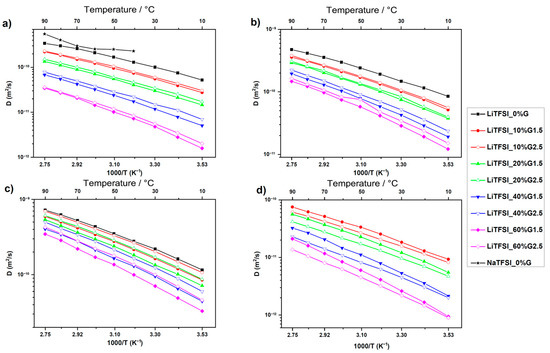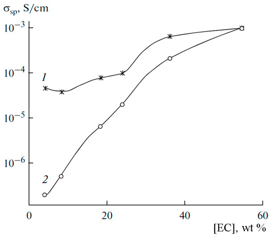 Table 3 shows that the majority of the gel NPEs have a conductivity of about 10−3 S/cm at Troom, and the best particles for filling are TiO2 and SiO2. These nanoparticles improve the mechanical strength of the gels and contribute to the conductivity of lithium and sodium ions. As shown in [64,65], SiO2 nanoparticles are involved in the dissociation of the electrolyte salt and, hence, the number of charge carriers increases.