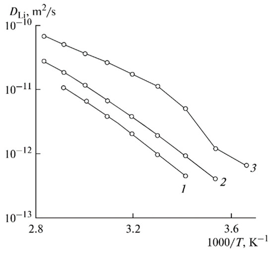 - Marinin, A.A.; Khatmullina, K.G.; Volkov, V.I.; Yarmolenko, O.V. Self-Diffusion of Lithium Cations and Ionic Conductivity in Polymer Electrolytes Based on Polyesterdiacrylate. Russ. J. Electrochem. 2011, 47, 717–725. [Google Scholar] [CrossRef]
