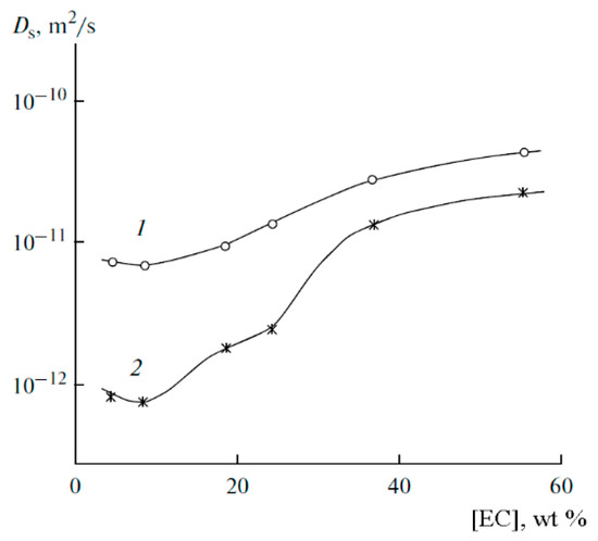 The concentration of lithium salt in electrolytes at which the maximum conductivity is reached varies from 0.5 to 1.0 M for different compositions. In [17], an empirical formula was developed to determine the optimal salt concentration of the electrolyte at which the maximum conductivity is achieved. For example, for LiClO4 propylene carbonate solutions, this concentration is 0.5 M, while for the currently most used LiPF6 solutions in mixed carbonate solvents, this concentration is 1.0 mol.