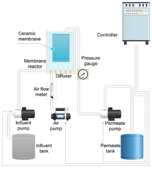 The submerged MBR operated in a working volume of 25 L flat-sheet ceramic membrane module (GVE Environmental Co., Ltd., Taoyuan, Taiwan) with a nominal pore size of 0.1 μm and an effective area of 0.25 m2, Figure 1. The Al2O3-based flat-sheet ceramic membrane had three layers: a surface layer, a transition layer, and a support layer, as shown in the scanning electron microscopy (SEM, see Supplementary Materials) image. The membrane was operated under an on–off mode (8 min on and 2 min off cycle) to relax the membrane module. The influent flow rate was adjusted to equal the effluent flow rate to maintain a constant water level. The systems were controlled automatically by timers and a pressure gauge. Air diffusers were positioned at the bottom of the reactor and the rear end of the membrane module for aeration and air scouring while the air supply was controlled by an airflow meter.
