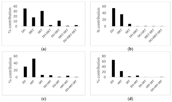 Percent contributions of all factors are presented as a chart in Figure 2 to determine the importance of factors. It could be seen from Figure 2a,b, and d that in the case of CBZ, COD, and phosphorus removal, DO was the most influential factor. However, according to Figure 2c, HRT had the most significant effect on ammonia removal.