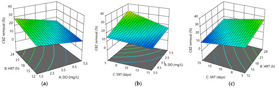 Figure 3a–c shows the 3D surface plot of CBZ removal versus two varying parameters at a fixed value of the third parameter. Again, a decrease in CBZ removal efficiency was observed with an increase in DO and SRT, with the effect of DO being a little greater than that of SRT.
