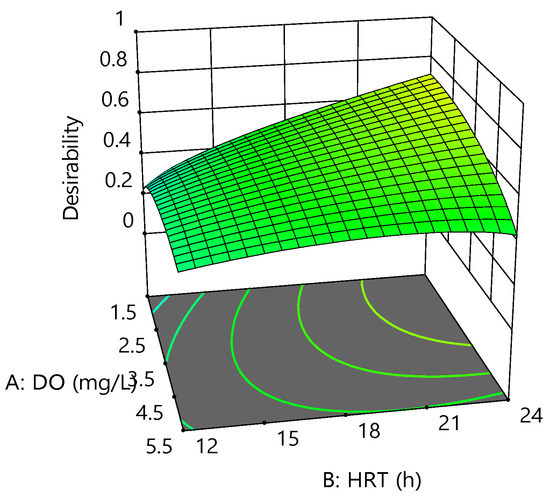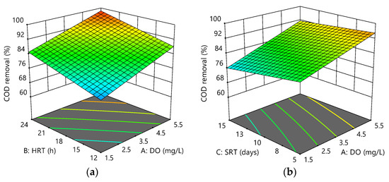 Positive coefficients indicated an increasing effect of A and B on the response, +1.93 and +0.60, respectively, suggesting that the response was more dependent on DO (A) than HRT (B). The current study confirmed a small effect of SRT on COD removal efficiency at short SRT (3, 5, and 10 days) before [38]. This phenomenon could be due to a decrease in the ratio of the active biomass to that of the total biomass (MLVSS/MLSS) following increasing SRT, indicating that the increased sludge age could decrease microbial activities.