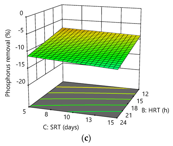 Phosphorus removal efficiency is inversely proportional to DO, HRT and SRT. As a result, the maximum phosphorus removal achieved was −5.91% at low DO (1.5 mg/L), HRT (12 h), and high SRT (15 days), indicating an anaerobic–aerobic environment was provided at this condition. Figure 6a–c shows the interactive effects of the variables on phosphorus removal.