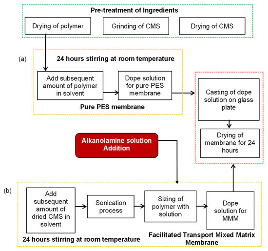 The pure polymeric membranes and facilitated transport mixed matrix membranes were developed by using polyethersulfone (PES), a carbon molecular sieve (CMS) and diethanolamine (DEA). N-methyl-2-pyrrolidone (NMP) was used as a solvent. Membrane synthesis, characterization, and gas permeability were reported elsewhere [45,46,47]. The flowsheet of the membrane synthesis is shown in Figure 1. The components’ concentration and characterization techniques are provided in Supplementary Materials (Table S1 and Figure S1). The results of the gas performance analysis are also presented in the Supplementary Materials (Tables S2 and S3).