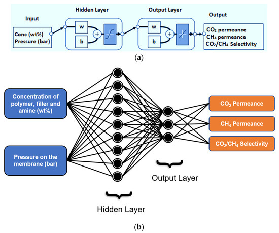 The ANN for the predictive membrane model was developed in a MATLAB environment. The experimental data were collected from our previous work on single gas permeation through PES-CMS-DEA facilitated transport mixed matrix membranes, as discussed in Section 2 and Supplementary Materials. A typical two-layer feed-forward backpropagation type network was chosen due to its ease of design and distribution of experimental data in chemical streams [39,48], as shown in Figure 2. Different concentrations (wt.%) of the polymer (PES) (20 wt.%), 10–30 wt.% filler (CMS) (10–30 wt.%) and diethanolamine (DEA) (5–15 wt.%) and the pressure of the gas (2–10 bars) were inserted as data inputs to the neural network. Tangent sigmoid and linear transform functions were used for correlating parameters in the ANN’s hidden and output layers, respectively. Three target layers, i.e., CO2 permeance, CH4 permeance, and CO2/CH4 selectivity, were included in the developed ANN. Equation (1) was used to normalize all experimental data against the maximum value for each variable to minimize the effect of numerical values on the model and to avoid asymmetry in data correlation. The experimental data were distributed randomly in training (50%), validation (15%), and testing (35%) sets: