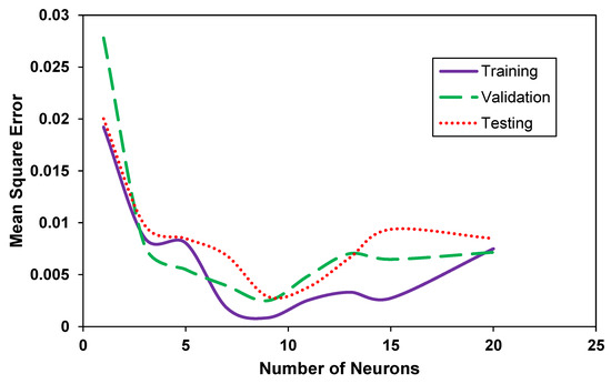 The number of neurons in the output layer was fixed at a value of 3 to correlate directly with the number of desired outputs, whereas the number of neurons in the ANN’s hidden layer was optimized [49]. The correlation is expected to improve with the increase in the number of neurons in the hidden layer, but the excessive number of neurons is also known to increase the complexity of the model and sometimes can reduce its accuracy [48]. In a typical optimization routine for the number of neurons, values from 1–30 were inserted in the ANN training mode [50] with an increment of 1 and were optimized using a minimum mean square error for all three sets (training, validation, and testing). Both Bayesian Coordinate and Levenberg–Marquardt algorithms were used. The latter was selected due to fewer iterations and better correlation (low mean square error (MSE) values). The following objective function was used to optimize the number of neurons in the hidden layer: