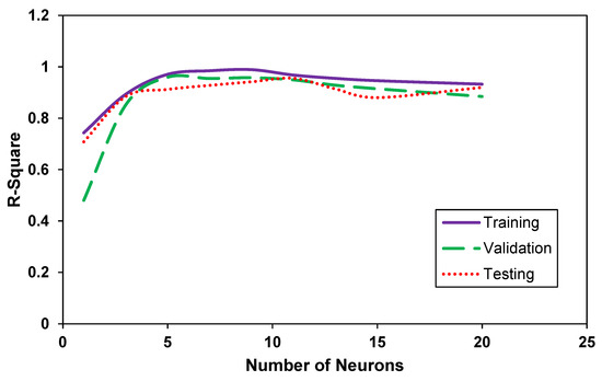 Similarly, the R-square values of the model correlation were compared against the number of neurons. Figure 4 shows that the R-square value increases steadily from around 0.75 to 0.95 when the number of neurons is incrementally increased from 1 to 4. After this value, a plateau was observed, where the R-square values fluctuate minutely. Although the R-square value generally drops slightly as the number of neurons increases after a value of 10, this parameter cannot be used to pinpoint the optimal number of neurons but shows a general trend in terms of equal data distribution across a central plane. Hence, it serves as a guiding parameter for ascertaining the choice for the optimal number of neurons using MSE in Figure 3.