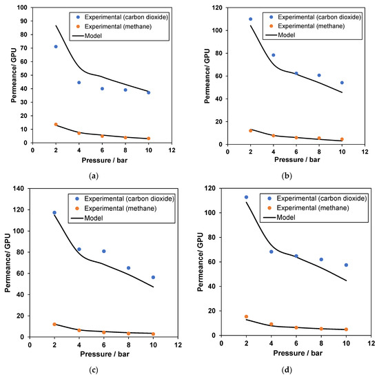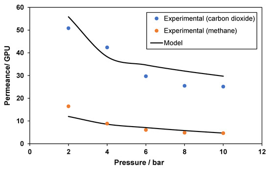 The permeance of methane (CH4) and carbon dioxide (CO2), with respect to the pressure of each gas for a pure polymeric membrane, is shown in Figure 5. CH4 permeance is well correlated at all pressures except 2 bar. However, the modeled CO2 permeance does exhibit small deviations from all values. At a pressure of 2 bar, the trend is slightly over-predicted to counter the under-prediction of CH4 permeance, as both values are interlinked through the selectivity. The slight overprediction of the CO2 permeance value at a pressure of 4 bar can be attributed to experimental errors. The overall correlation for CO2 permeance is in line with the generic best fit observed for the rest of the experimental values for a pure polymeric membrane.
