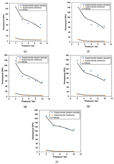 Model correlation for CO2 and CH4 permeances with respect to pressure for (a) 20% polymer, 10% filler, and 5% amine; (b) 20% polymer, 10% filler, and 10% amine; (c) 20% polymer, 10% filler, and 15% amine; (d) 20% polymer, 20% filler, and 5% amine; (e) 20% polymer, 20% filler, and 10% amine, (f) 20% polymer, 20% filler, and 15% amine; (g) 20% polymer, 30% filler, and 5% amine; (h) 20% polymer, 30% filler, and 10% amine; and (i) 20% polymer, 30% filler, and 15% amine (all percentages in weight percent). Experimental data from [45,46,47]. Detailed data are provided in the Supplementary Materials.