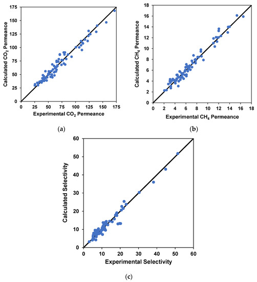 Parity plots for (a) calculated and experimental CO2 permeance, (b) calculated and experimental CH4 permeance, and (c) calculated and experimental selectivity for the experimental data.
