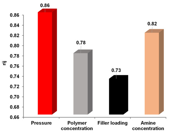 Figure 8 shows that of all the process input variables, pressure has the highest impact on the performance of developed membranes, followed by amine concentration, and then polymer concentration and filler loading. It was observed that gas permeance decreased with an increase in pressure, which is due to the polymer’s glassy nature. On the other hand, with the increase in amine concentration, CO2 permeance increases due to the affinity of CO2 with amine. Moreover, the sensitivity analysis results showed that pressure and amine concentrations are the most influential variables on gas permeability through facilitated transport mixed matrix membranes. These results are in agreement with the literature [60].