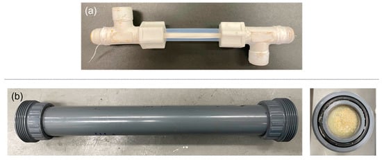 Scale-up of membrane distillation modules. (a) Lab-scale testing module (0.5-inch diameter); (b) pilot-scale testing module (2-inch diameter).