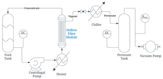 The hollow fibers provided were assembled into 0.5-inch diameter or 2-inch diameter modules, as shown in Figure 1, and tested at the Environment & Water Innovation Centre of Innovation (EWTCOI) and our facility, Separation Technologies Applied Research and Translation Centre (START), respectively. For the 0.5-inch modules, after the target temperature of the feed was reached, temperature sensors for the feed inlets and outlets were calibrated. The feed water was recirculated through the lumen side of the hollow fibers. The liquid feed entered the module in an upward direction to minimize air bubbles in the module. Once the feed inlet temperature in the membrane module reached a steady state, the vacuum pump was switched on to create a vacuum in the shell side of the hollow fibers. The timer for permeate collection was started and permeate was collected by condensing the water vapor either in an ice chip bath, which was periodically refilled with ice chips (0.5-inch modules) or using a chiller at 15 °C (2-inch modules). The amount of permeate collected was gravimetrically determined using a weighing scale and the electrical conductivity (EC) was measured. Table 4 shows the conditions for each of the tests and Figure 2 presents a process flow schematic for the in-to-out setup of VMD used in this study, which was a semi-continuous operation with variation in EC. The feedwater was filled with a NaCl solution whenever the EC value was nearly doubled or the tank was at half capacity, whichever came first. Each time the feed was filled, the vacuum was switched off until the target temperature of the feed was reached again.