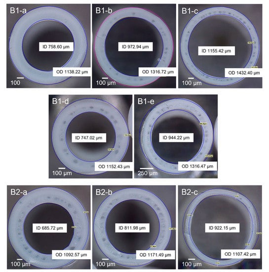 The membranes fabricated under these conditions were visually examined using an optical microscope, and the fiber images are displayed in Figure 3 (B1-a to B1-e). The membranes were visually examined and their performance in handling during spinning was also checked. From B1-a to B1-c, the coagulation bath was kept at room temperature (≈24 °C). Membrane B1-a showed the highest strength (i.e., did not break nor collapse during spinning) with the highest thickness and the smallest dimensions (i.e., internal diameter, ID, and outer diameter, OD). Membrane B1-b was in the middle of B1-a and B1-c in terms of dimensions and showed the characteristic sandwich structure, with a thin layer of small-size macrovoids that was present in all subsequent batches. B1-c possessed a softer structure than B1-a as it easily collapsed due to handling during spinning; therefore, B1-c spinning conditions were not retested. Membranes B1-d and B1-e had the coagulation bath at a higher temperature. B1-d had a similar dimension to B1-a, while the structure changed to a more porous one than B1-a due to the higher coagulation bath temperature. The results are consistent with numerous similar observations reported in the literature [,,]. It has been well established that an increase in coagulation bath temperature results in a faster solvent–non-solvent exchange. Consequently, it leads to a more porous structure, while a slower de-mixing at lower temperatures results in a denser film []. Membranes B1-d and B1-e were fabricated at a higher coagulation bath temperature of ~40 °C and bore fluid flowrates of 1.5 and 3.0 mL/min, respectively. As shown in Table 3, the increase in bore fluid flowrate resulted in an increase in ID and OD of the membrane B1-e. A similar trend was also observed for membranes B1-a, B1b and B1-c, where the diameter increased as the bore fluid rate increased from 1.5 to 4.5 mL/min, also leading to a reduced wall thickness. Membrane B1-e started to lose its round shape and the membrane strength significantly decreased when elevating the bath temperature. From these results, it is revealed that the membrane dimensions increase and thicknesses reduce when the bore flowrate is boosted [,].