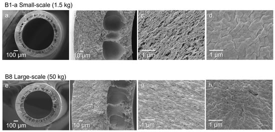 Figure 4 shows the FESEM images of the membrane samples from a small batch size (1.5 kg, B1-a) and a large production-scale batch size (50 kg, B8). The SEM images confirm the formation of the novel sandwich-like structure with a porous inner layer filled with macrovoids between two thin, denser outer layers. They are consistent with the previously reported literature [,,].