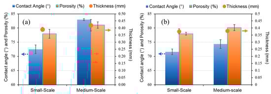 Porosity, contact angle, and thickness of produced hollow fiber membranes in each batch. Small scale: 1.5 kg batch; medium scale: 20 kg batch. (a) Fibers made with PVDF 1 dope; (b) fibers made with PVDF 2 dope.