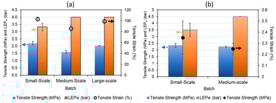 Tensile strength and strain and liquid entry pressure (LEPw) of water in produced hollow fiber membranes in each batch. Small scale: 1.5 kg batch; medium scale: 20 kg batch; large scale: 50 kg. (a) Fibers made with PVDF 1 dope; (b) fibers made with PVDF 2 dope.