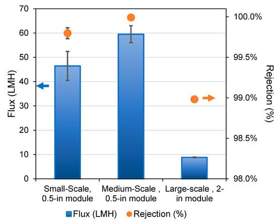Flux and rejection of VMD tests in each batch using PVDF 1. All tests were performed for time ≥ 1 h using 0.5-inch modules and time ≥ 100 h using 2-inch modules. Small scale: 1.5 kg batch; medium scale: 20 kg batch; large scale: 50 kg.