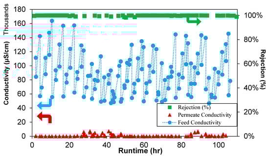 In order to evaluate the long-term performance and to assess failure modes such as pore wetting under the given test conditions, the 2-inch modules were tested with synthetic seawater prepared with a 35 g/L NaCl, in a batch mode previously described, for over 100 h. The pilot unit was operated for 5–6 h per day with the feed water replenished at the beginning of the day. The flux and the salt rejection data for the 2-inch modules are summarized in Figure 8. Throughout the test duration, the salt rejection and the permeate flux remained consistent at ~100% and within 8–9 L/m2·h, respectively, despite the variations in feed concentrations due to the batch mode operations previously described. The stable permeate flux through the test duration and under the given conditions indicates that the membrane pore structure remained intact with no pore wetting, which would have otherwise caused a spike in the permeate conductivity, not seen in this study.